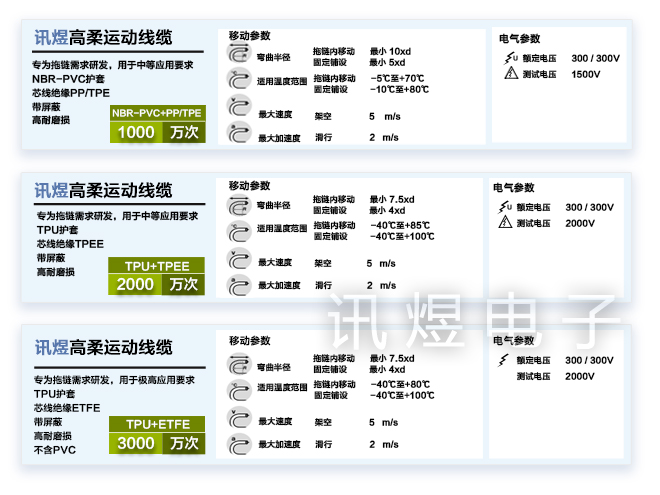 訊煜電子的高柔運動線纜按“運動次數(shù)”可分為: 1000萬次、2000萬次和 3000萬次3大類。