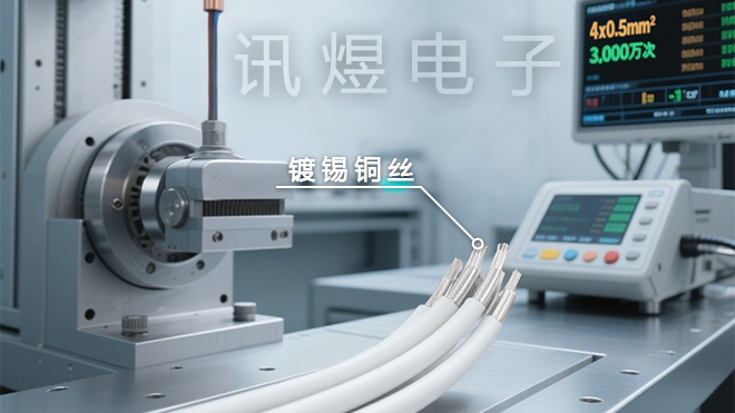 訊煜高柔運動線纜、潔凈線纜、真空線纜,這些線纜能彎折2000~3000萬次不斷芯、穩(wěn)定運行,核心就在線纜內(nèi)部那一根根多股精細抗氧化鍍錫銅絲。比如:4x0.5 mm2、 3000萬次的高柔運動線纜,要用到4根截面積為0.5 mm2的單芯線,每根芯線導體選用的是抗氧化鍍錫銅(鍍錫銅更耐用、更柔軟、耐腐蝕性、抗氧化及信號傳導性更強)。 先把14根直徑0.08mm的細銅絲合絞為一組,然后再用7組合絞后的銅絲進行復絞,相當于把98根超細銅絲像麻花辮一樣緊密交織。 復絞結(jié)構(gòu)不僅讓芯線更加牢固,也讓銅絲間的應力均勻分散,即使經(jīng)過數(shù)千萬次彎折,銅絲的導電性能依舊穩(wěn)定可靠!